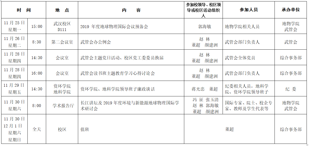 2019-2020学年第一学期第12周校区主要工作及活动安排表