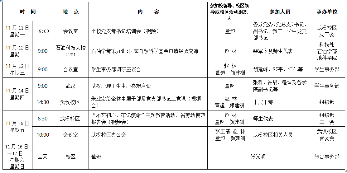 2019-2020学年第一学期第11周校区主要工作及活动安排表