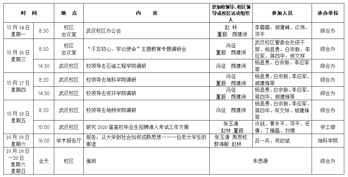 2019-2020学年第一学期第6周校区主要工作及活动安排表
