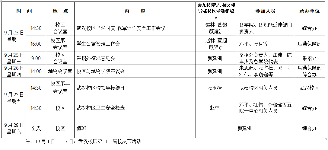 2019-2020学年第一学期第4周校区主要工作及活动安排表