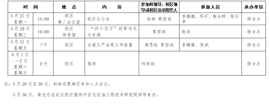 2018-2019学年第二学期第15周校区主要工作及活动安排表