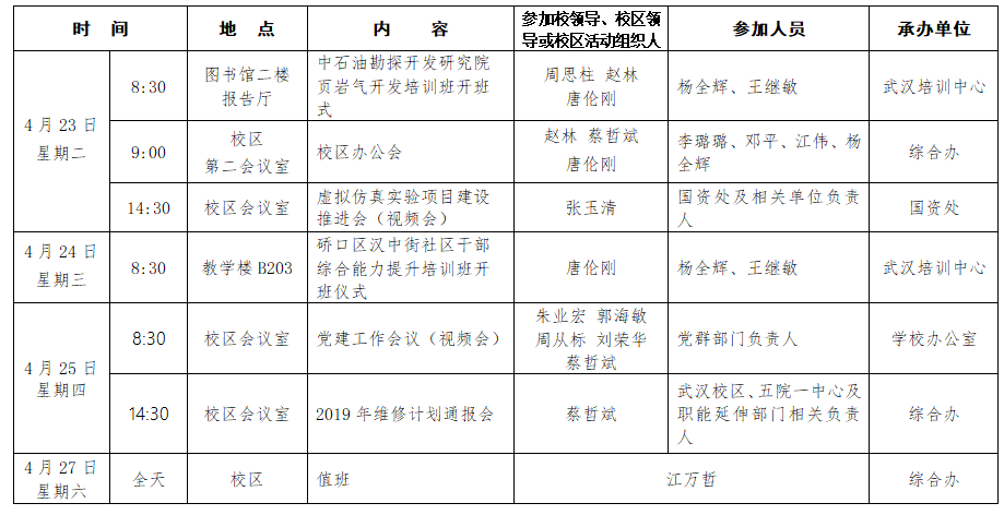 2018-2019学年第二学期第8周校区主要工作及活动安排表