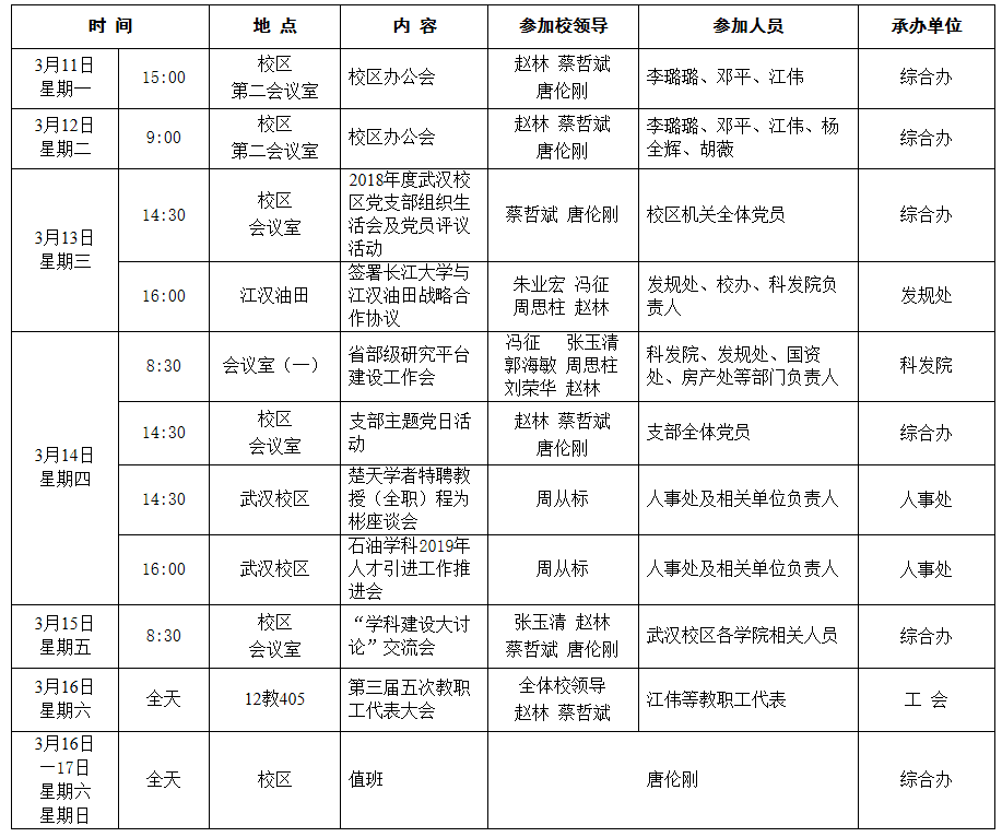2018-2019学年第二学期第3周校区主要工作及活动安排表
