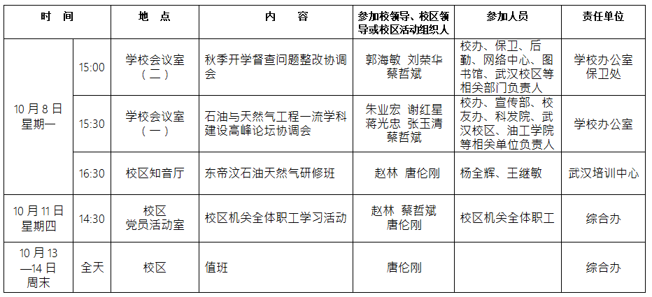 2018-2019学年第一学期第4-5周校区主要工作及活动安排表