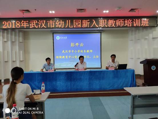 (通讯员王继敏)8月11日至8月15日,武汉市2018年幼儿园新入职教师培训在校区进行。8月11日早上,在庄严的国歌声中,培训班开班典礼在校区图书馆报告厅举行,培训正式拉开帷幕。武汉市中小学校长教师继续教育中心党总支书记、主任彭开云,武汉校区副校长唐伦刚、武汉培训中心主任杨全辉及近百名新入职教师参加了开班典礼。