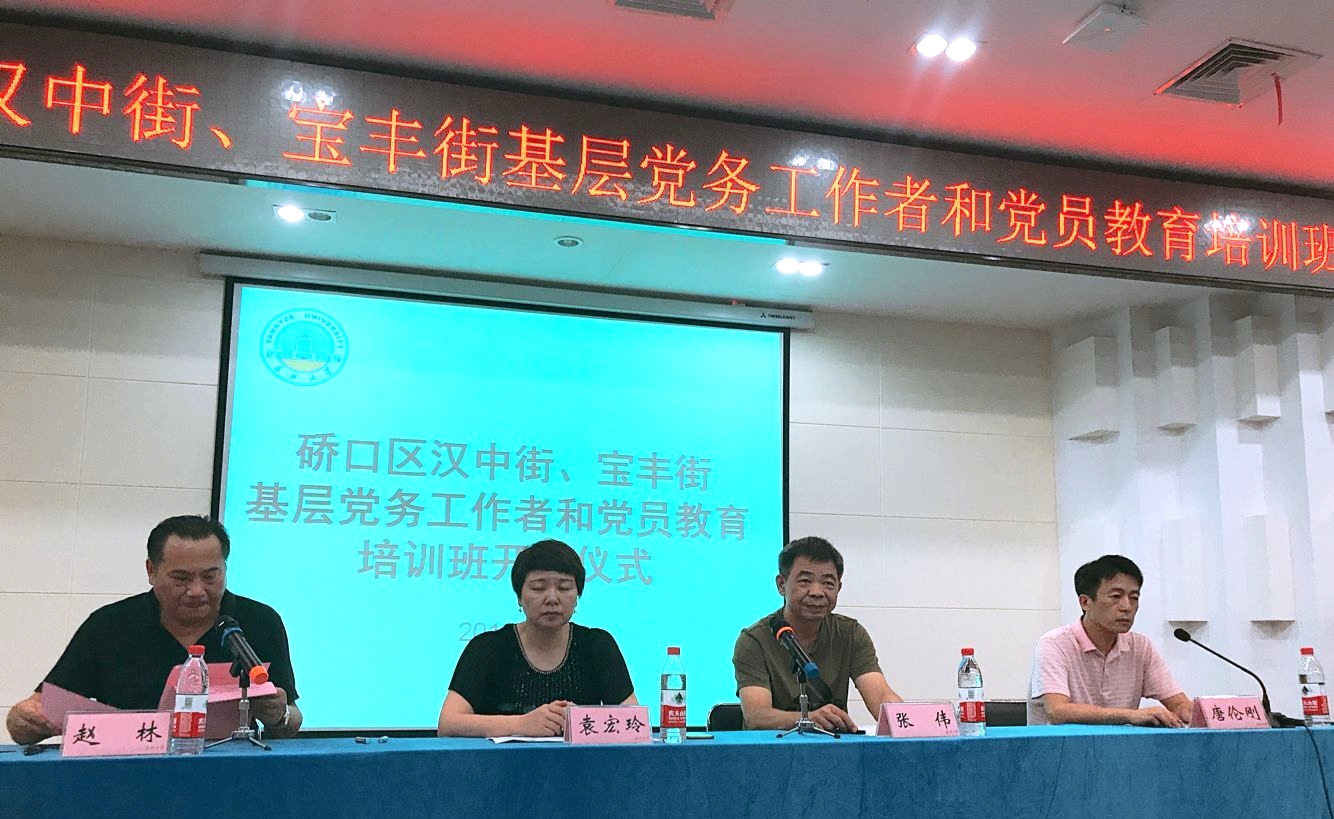 (通讯员 王继敏) 8月31日,伴随着庄严的国歌声,“2018年硚口区汉中街、宝丰街基层党务工作者和党员教育培训班”开班仪式在校区图书馆报告厅举行。