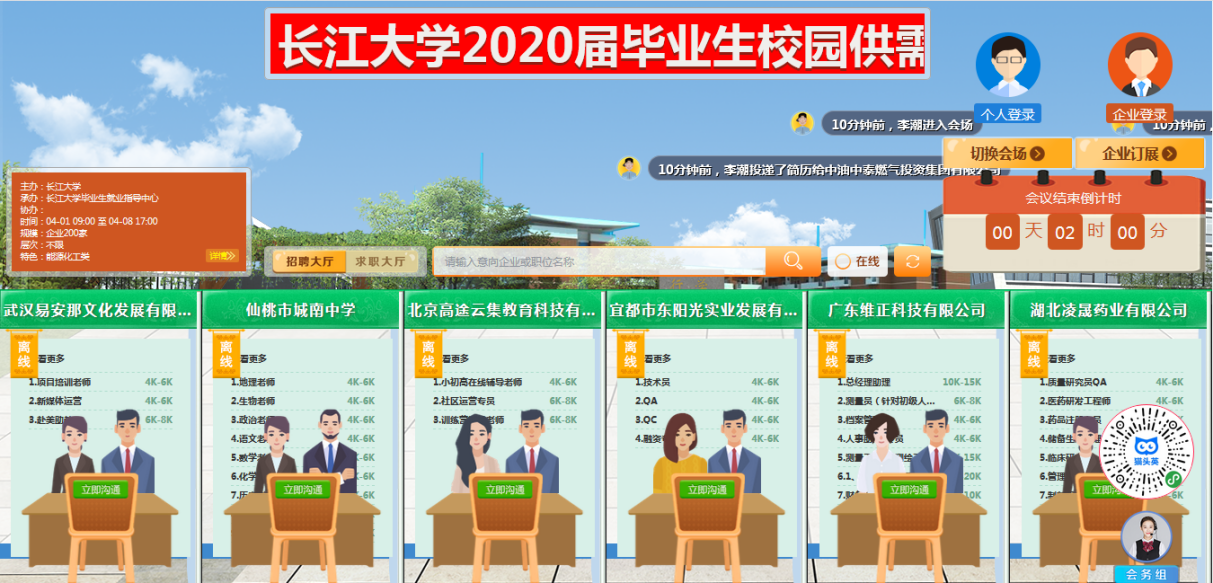 此次线上招聘会于2月27日正式对外发出邀约,通过学生报名端口进行报名并投递简历,4月1日-8日为正式面试阶段,用人单位与求职者可通过“云人才市场”平台发起交流和视频面试。
