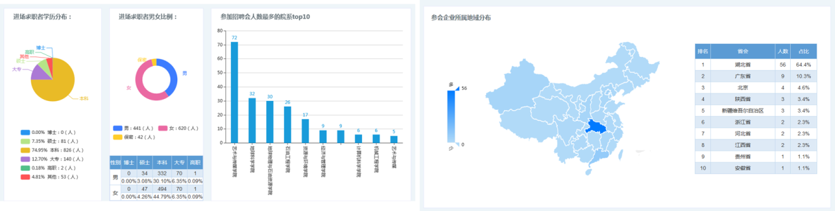 入驻会场的企业共计87家,其中国企16家,事业单位3家,私企53家,外企2家;入驻单位以湖北为主,共56家占比64.4%,此外还包括来自广东、北京、陕西、新疆等多个省/市及自治区,提供包含地质综合解释、地球物理、地质灾害防治工程、新媒体运营、工程设计、辅导教师等多种岗位,呈现层次高、岗位优且分布广的特点。会场拟招聘岗位数8420个,浏览量高达8803人次;求职者1103人,其中男生441人,女生620人;从参会学生的学历分布来看,以本科为主,共826人,占比高达74.89%。见面会结束,求职者投递简历854份,本校484人,求职发起视频面试次数596次,企业发起视频面试次数243次,初步意向1028人次。