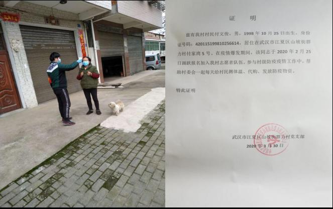 家在武汉的资工21603班付文俊在得知疫情紧急,人手吃紧后,就踊跃报名参加志愿者工作。在村民被要求居家隔离后,江夏区山坡街道群力村空旷的街道上,每日只见他和同事奔忙的身影。帮助村民购买各种生活用品、测量体温,在村口防疫站值班……虽马不停蹄,却甘之如饴。他说:“前线的事情总需要人做,我的家乡和祖国现在‘生病’了,我愿意迎难而上,为疫情防控尽绵薄之力,不枉‘英雄的人民’这个称呼。”