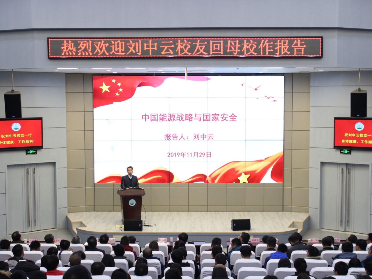 (通讯员 万文婷 学生记者 房元龙/文 张佳睿/摄)11月29日上午,我校79级校友,中国石油化工集团公司副总经理刘中云回母校,带来题为“中国能源战略与国家安全”的报告。校党委书记朱业宏主持报告会,党委副书记、纪委书记蒋光忠,校办、武汉校区管委会、资环学院、地物学院、地科学院、油工学院相关负责人及全体中层干部、师生代表聆听报告。