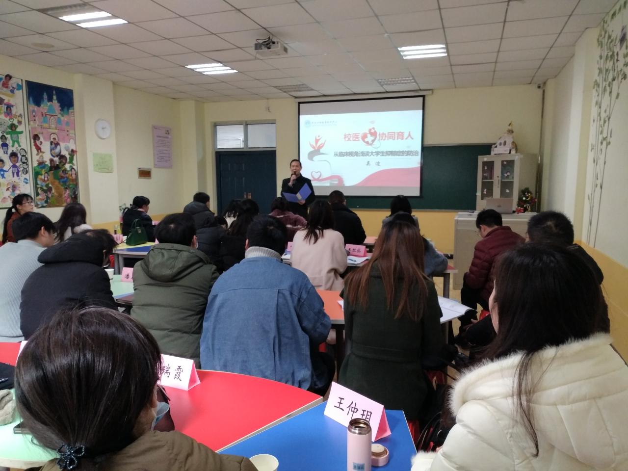 (通讯员 刘芳)为提升我校教师队伍心理育人水平和能力,更好推动校园抑郁症防治工作,1月16日下午,“抑郁症防治”专题校医协同育人论坛在武汉校区学生心理健康教育中心团体辅导室顺利开展。此次论坛特邀武汉市精神卫生中心心理治疗师吴边医生作报告,校区各学院分管学生工作领导、专职辅导员及学生事务部全体成员参会,会议由学生事务部部长许战主持。