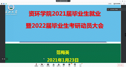 (通讯员林欣慧)对越来越严峻的就业形势,2021届毕业生如何面对,2022届学生如何做好学业规划?2021年1月24日下午19时,资源与环境学院在腾讯会议平台上召开2021届毕业生就业暨2022届毕业生考研动员大会。资环学院党委副书记范梅英老师、学院分团委书记严丽萍老师、学生事务办公室主任李春花老师、2021届毕业生和2018级本科生参加此次会议。