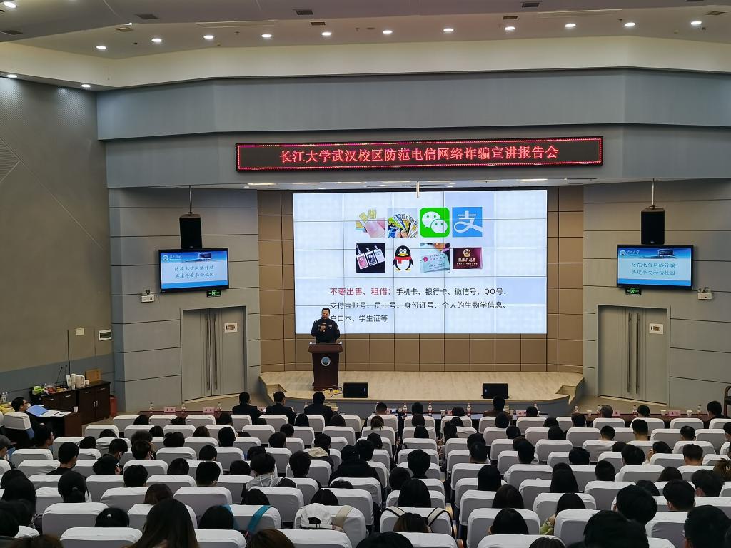 (通讯员王宁)防范电信网络诈骗,共建平安和谐校园。4月8日晚,武汉校区在学术报告厅举行防范电信网络诈骗宣讲报告会,特邀蔡甸区公安分局国保大队、反诈中心、蔡甸街派出所联合来校开展防范网络电信诈骗案例警示教育和知识普及。武汉校区领导、武管会相关部门负责人,各学院党委书记、副书记,全体学工人员、安保人员及学生代表共300余人聆听报告。武汉校区学生事务部部长许战主持报告会。
