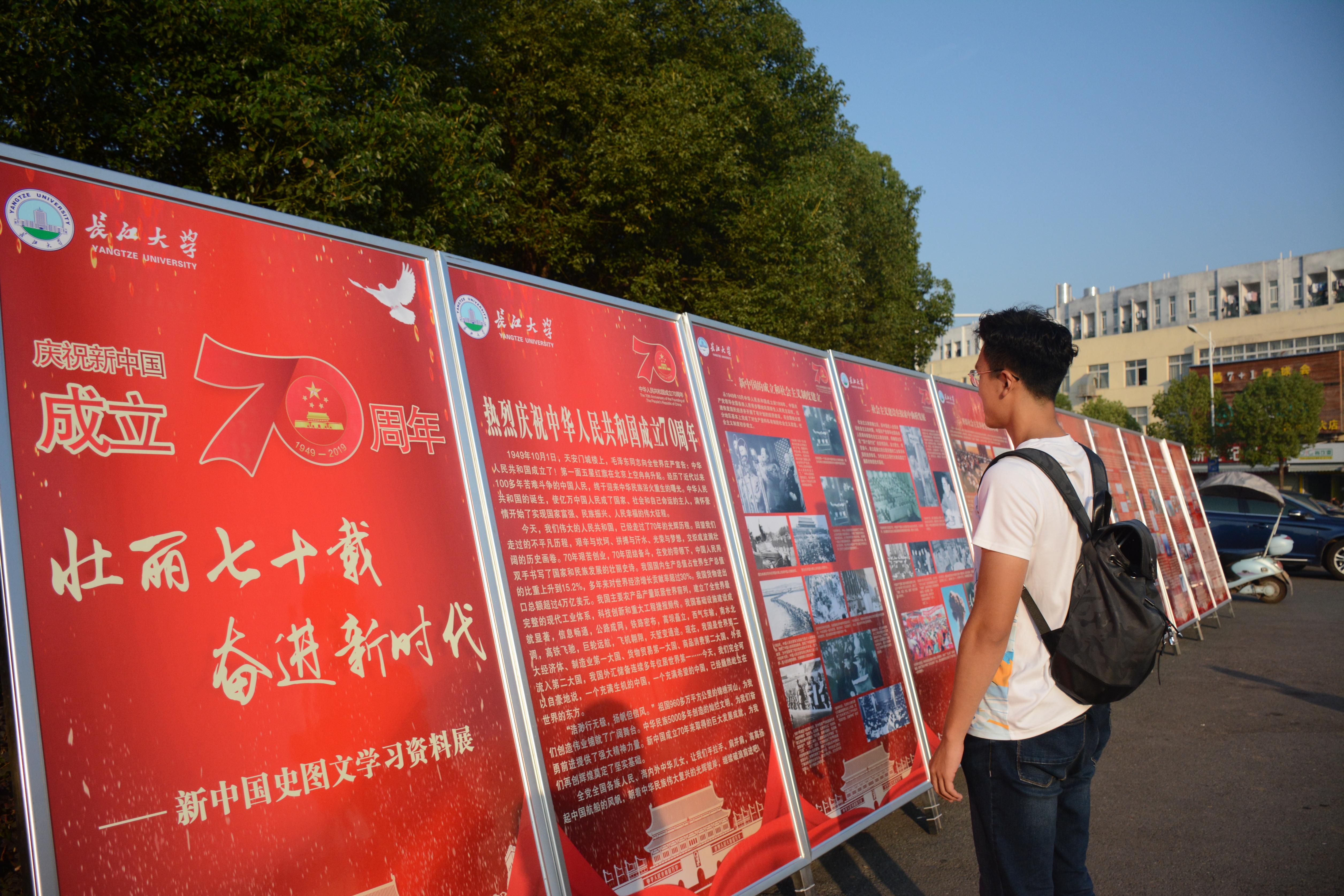 贴着小红旗的同学们笑着走出校门,在武汉校区大门前的“新中国史图文学习资料展”驻足停留。在欢庆之余,对新中国壮丽七十年的奋进史也有了更深的了解。