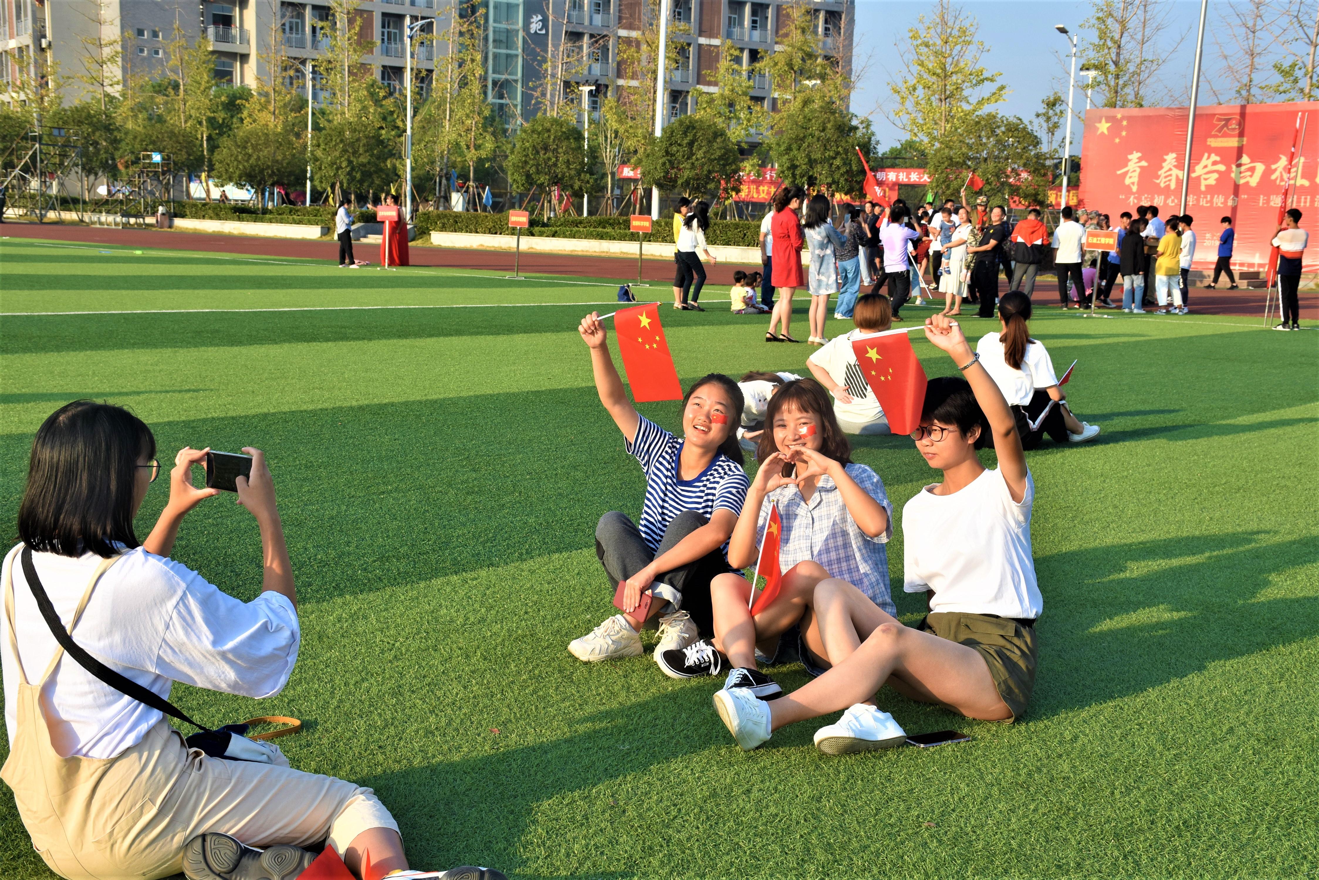 操场上,同学们相合影留念,挥舞着国旗的同时,还不忘为祖国“比个心”,润泽大道两侧早已插好了节日的彩旗,为“礼赞新中国,喜迎军运会,欢庆校友节”三喜临门的武汉校区“呐喊助威”。