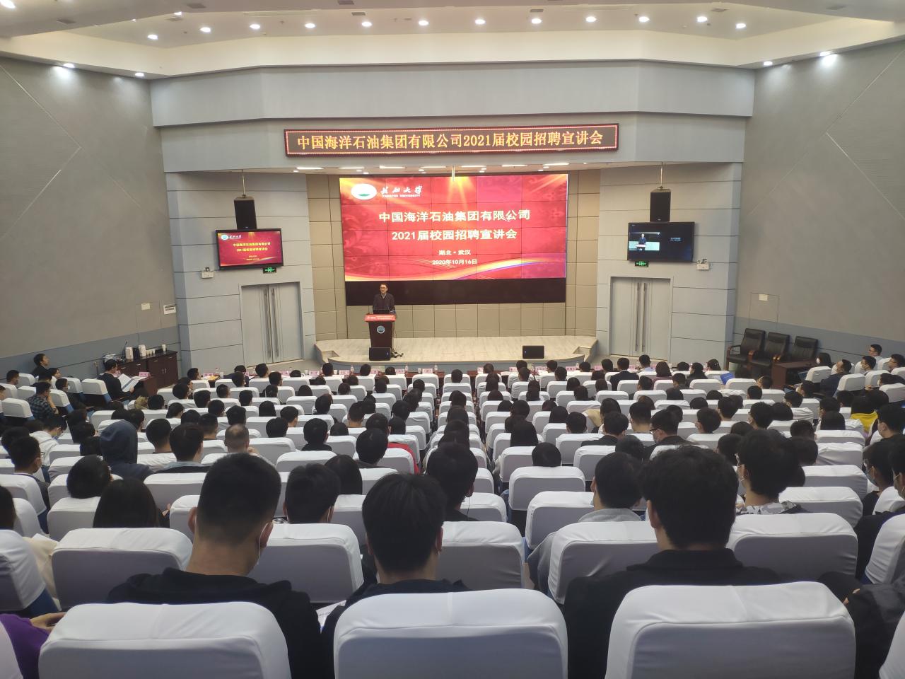(通讯员 王宁/文 学生记者 戴玉 张鹿小/摄)10月16日,中国海洋石油集团有限公司2021届校园招聘宣讲会在武汉校区举行,荆州校区远程同步直播。学校党委副书记王建平、中国海洋石油集团有限公司人力资源部副总经理戴照辉、武汉校区管委会常务副校长赵林、相关学院负责人及2021届毕业生参加招聘宣讲活动。