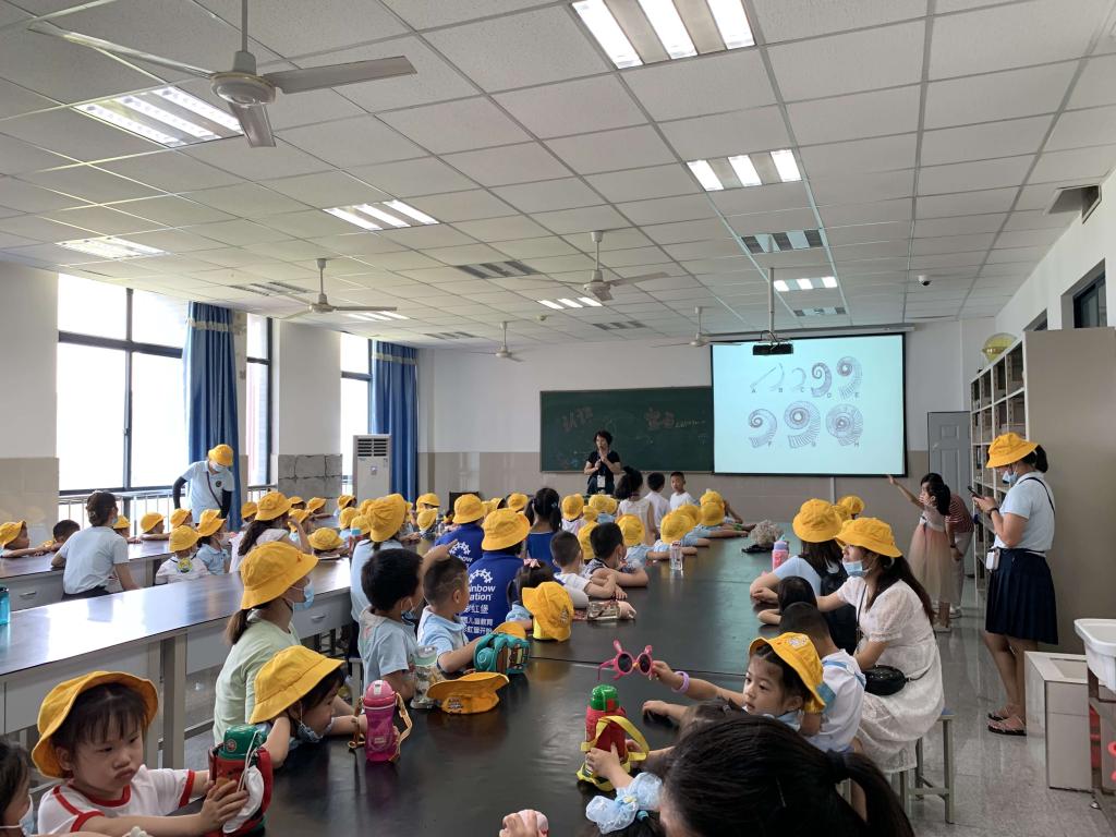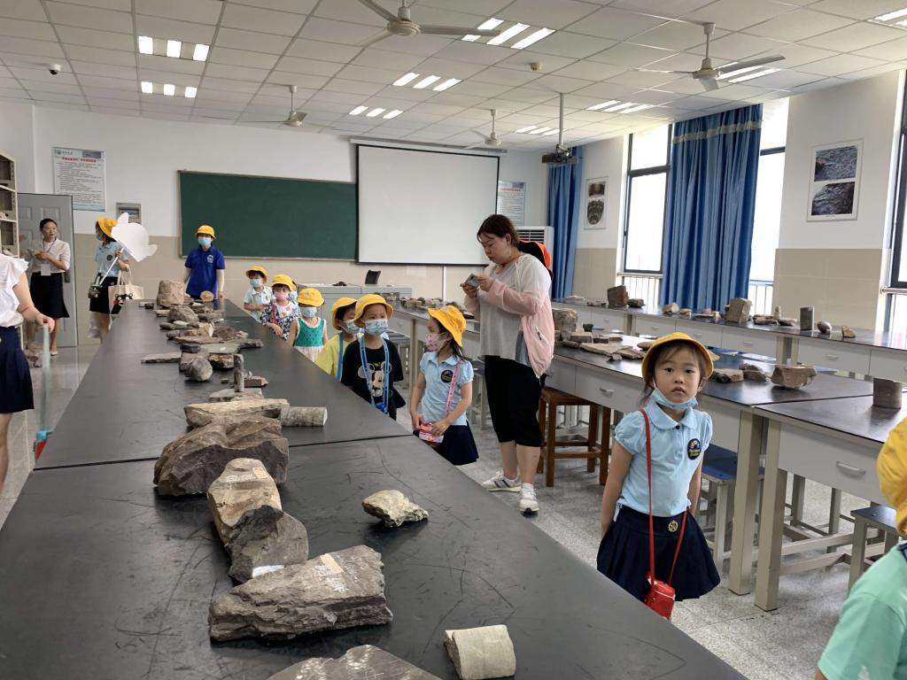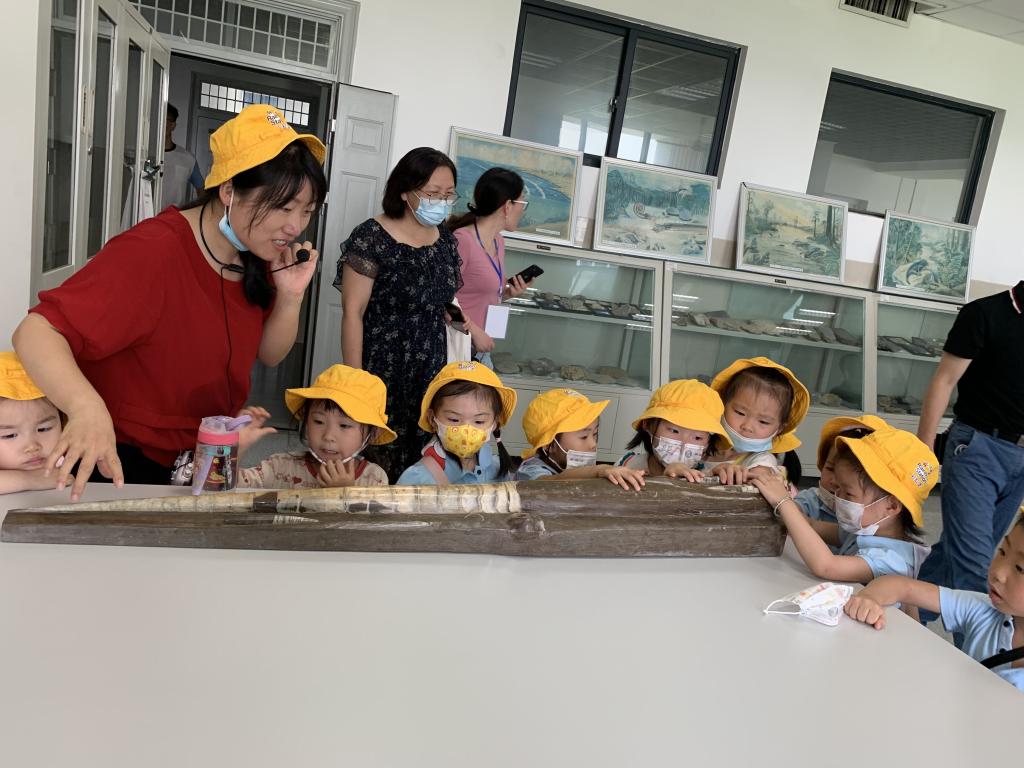 小朋友们参观的第二站是化石陈列室,实验教师刘俊玲、胡九珍和龙颖波早已将房间开窗通风,并设计好参观路线,从安全、舒适、求知三方面为小朋友的到来做好充分准备。当孩子们第一次近距离看到种类繁多、形态各异的生物化石时都惊喜不已。参观过程中,老师们一一讲解了生物化石的名称以及形成过程,再现了一幅幅栩栩如生的地质历史画面。角石化石吸引了小朋友们关注,有说是“竹笋”的,有说是“象鼻”的,也有说是“宝塔”的,小朋友们迸发出了星星点点的智慧闪光,一个个化身“好奇宝宝”,“菊石是大蜗牛吗?”,“海百合是花花吗?”,“恐龙蛋里会孵化出大恐龙吗?”,这些问题激发了孩子的求知欲和好奇心,将带着他们走向更广阔的知识天地。