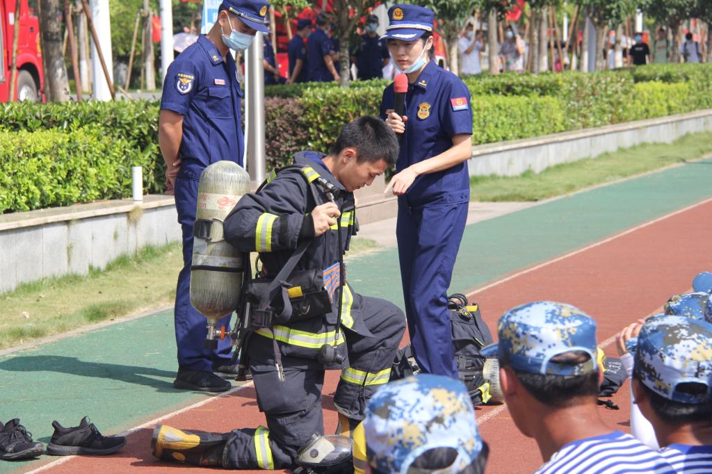 首先,消防战士向同学们详细介绍了校园生活中的消防安全注意事项,并提醒同学们要时刻注意消防安全。随后,战士们向大家展示消防服、灭火器、液压剪扩钳、无齿锯、消防排烟机、消防水炮等一系列消防用具。在消防服的穿戴体验环节,两名同学全副武装站在各自的跑道上进行了一场负重赛跑。穿着防护装备的他们,每一步都跑得很吃力,正如两位同学体验之后所言:“头盔太重了,压得我的脖子酸痛;穿着它就感觉是大夏天捂着棉袄一样,特别热,不得不说,消防战士们真是太辛苦了”。