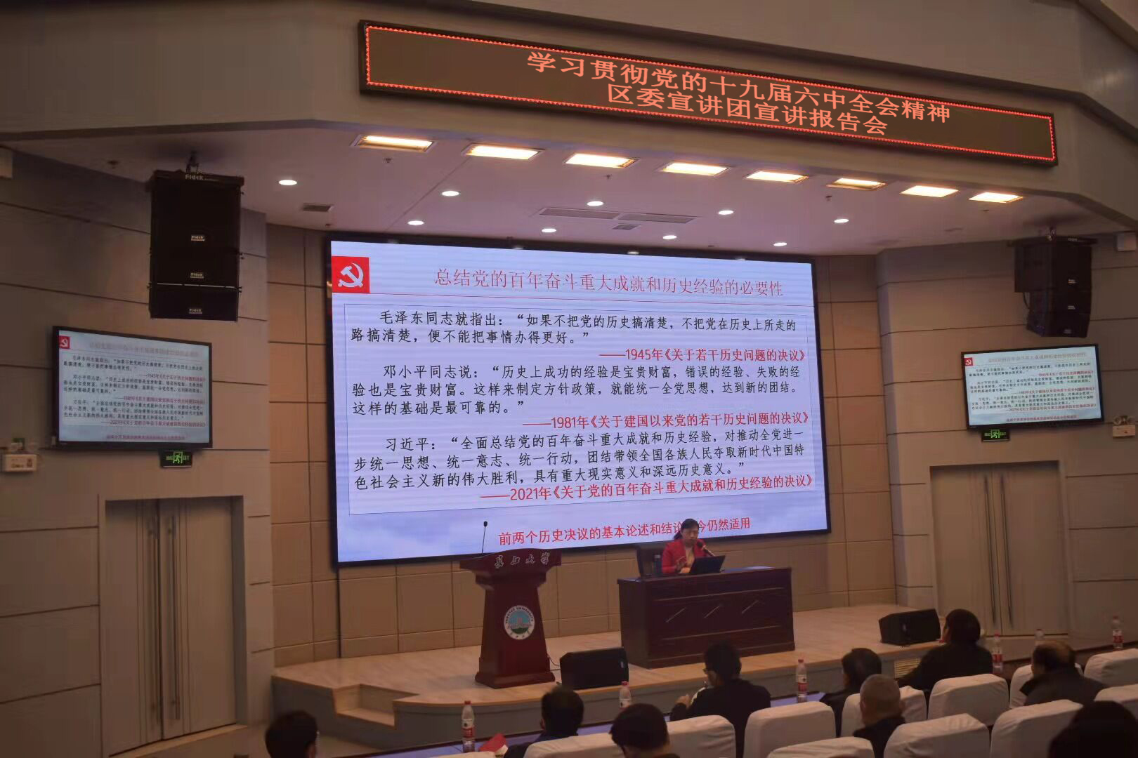 宣讲会上,郭群英以“以史为鉴,开创未来”为主题,从“全会召开背景”“全会主要内容”“全会学习宣传”三个方面对六中全会进行了介绍,对全会精神进行了解读。郭群英说,学习全会精神要全面准确领会,深刻把握核心要义、精神内涵,进一步统一思想、凝聚共识;通过宣传引导,激发学习热潮,将学习教育融入学生思想教育教学活动中。