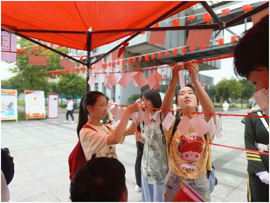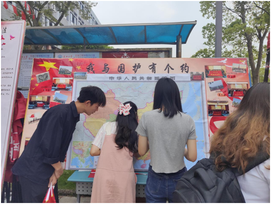 活动现场,同学们可以在中国地图上找到自己的家乡并为其勾上红色的一笔,之后移步许愿区在卡片上写下自己的祝福。在这些卡片中,有人写到了对自己大学生活的憧憬,也有人写到了对父母的感恩,还有人写到了对祖国的赞美和歌颂。在答题区同学们通过知识竞赛在娱乐的同时也丰富了自己的党史知识。在体能区加入了国护队日常训练的部分内容,如抱腹端腿、双人俯卧撑,使大家在参与游戏的同时也获得了锻炼的好方法。同时,56式半自动步枪、92式指挥刀、95式自动步枪等装备的展示,使同学们对国护装备有了近距离的认识。本次活动还对第一届国护队至第九届国护队风采进行了照片展示,也向校区师生展现了一个稳步发展、团结一心的优秀的半军事化学生组织的精神风貌。