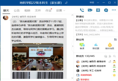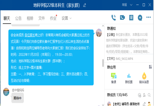 “云端相聚,家校合育”,借助QQ群打造家校协同育人体系是地科学院践行“三全育人”的重要举措;新生家长会也是该院长期坚持的优良传统,获得了家长们的一致好评与支持!