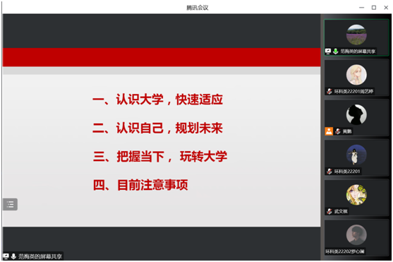(通讯员 周艺婷)为帮助资环学院2022级新生增进对大学生活的了解,尽快适应大学生活,11月22日晚,学院党委副书记范梅英通过线上形式开展了“梦想启航,资环飞翔”新生入学教育讲座。讲座由班级导师李民顺主持,辅导员黄鹏及学院2022级全体学生参与。