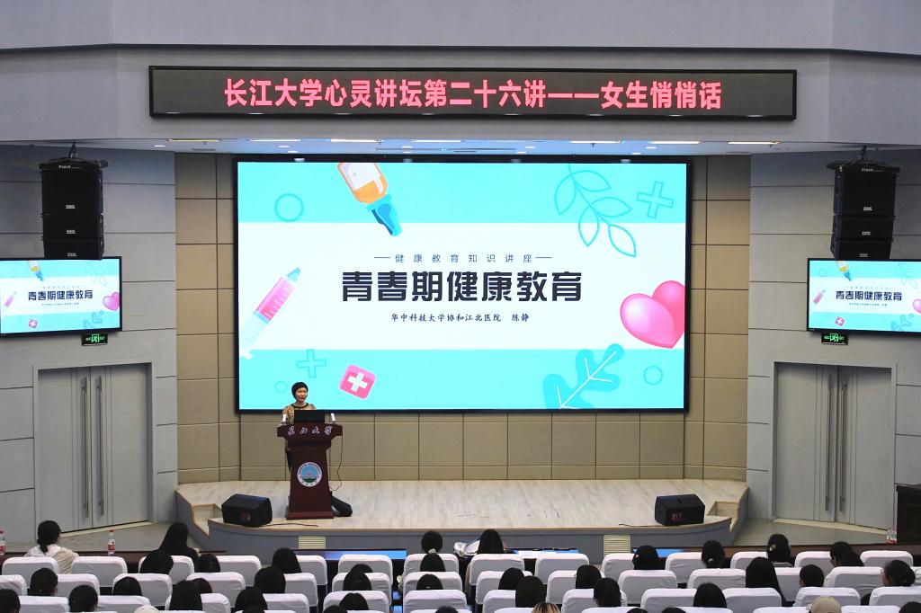 (通讯员 任倩、李双 摄影 温芷柔)为进一步增强我校女生对女性健康知识的了解,促进学生身心健康和全面发展,2023年5月11日下午,我校心理健康教育中心特邀华中科技大学协和江北医院妇产科陈静主任做了题为“女生悄悄话”的女生青春期健康知识讲座,校区300多名女学生和辅导员老师聆听讲座。