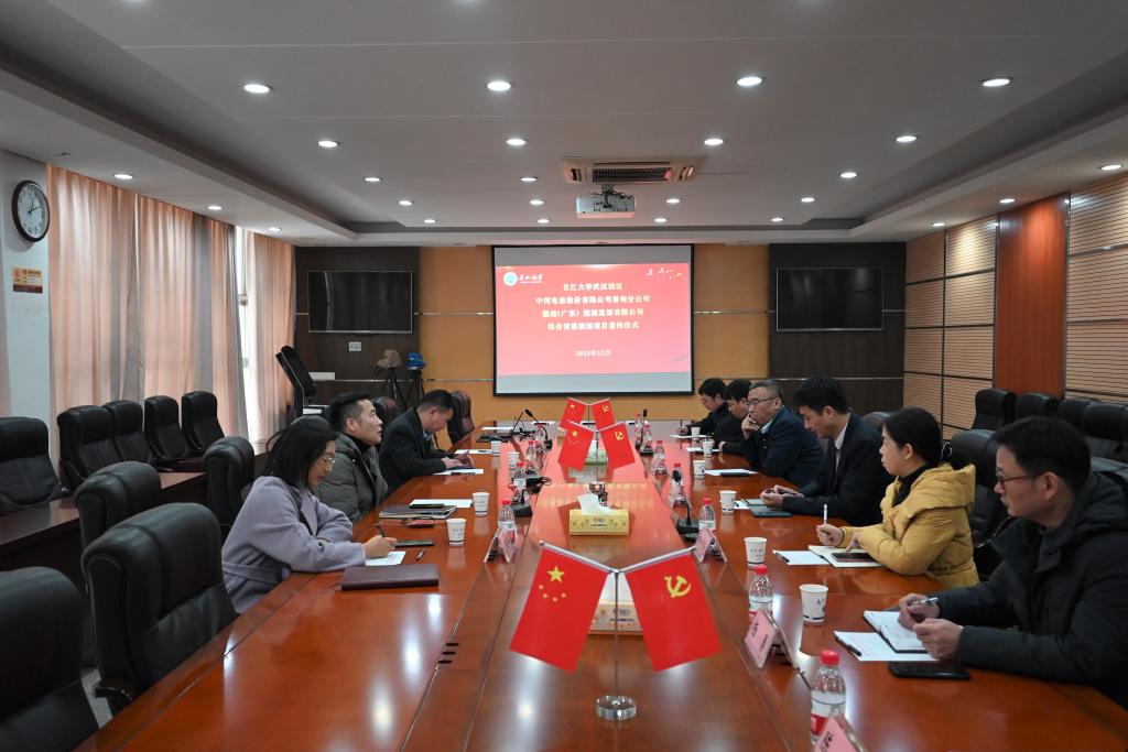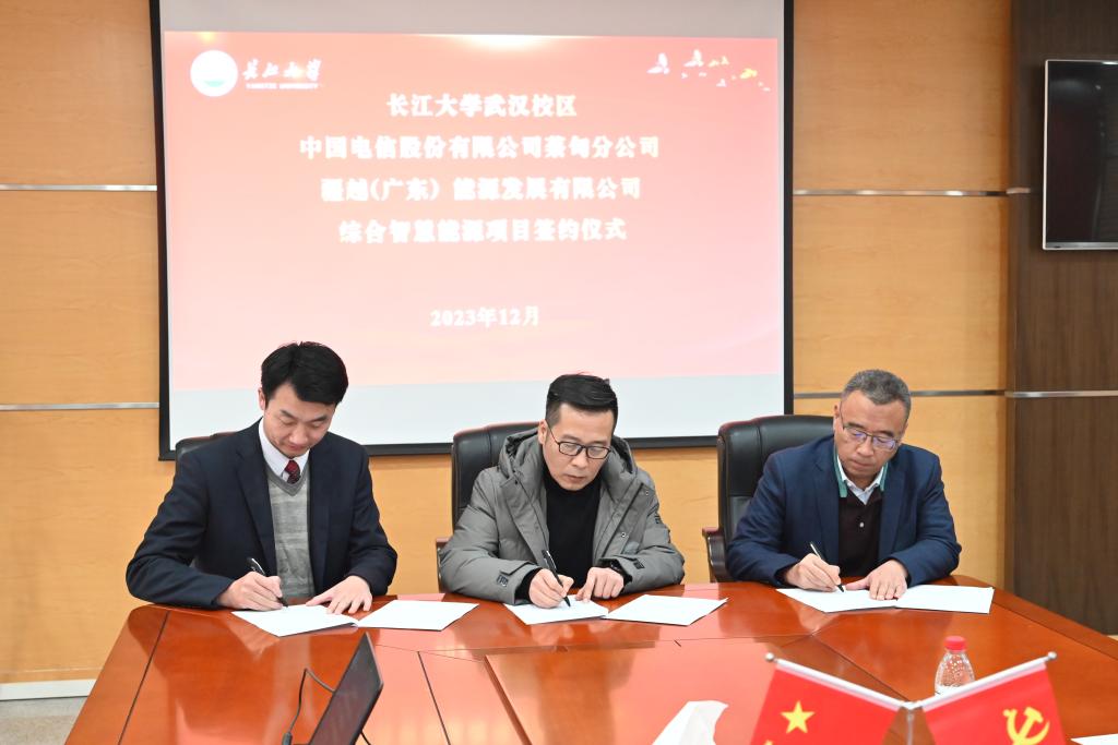 (通讯员 余子昂)12月29日下午,武汉校区与中国电信股份有限公司蔡甸分公司(以下简称“电信蔡甸分公司”)、疆越(广东)能源发展有限公司(以下简称“疆越公司”)三方就综合智慧能源项目签署开发合作意向书,校区党工委书记崔青山主持签约仪式。