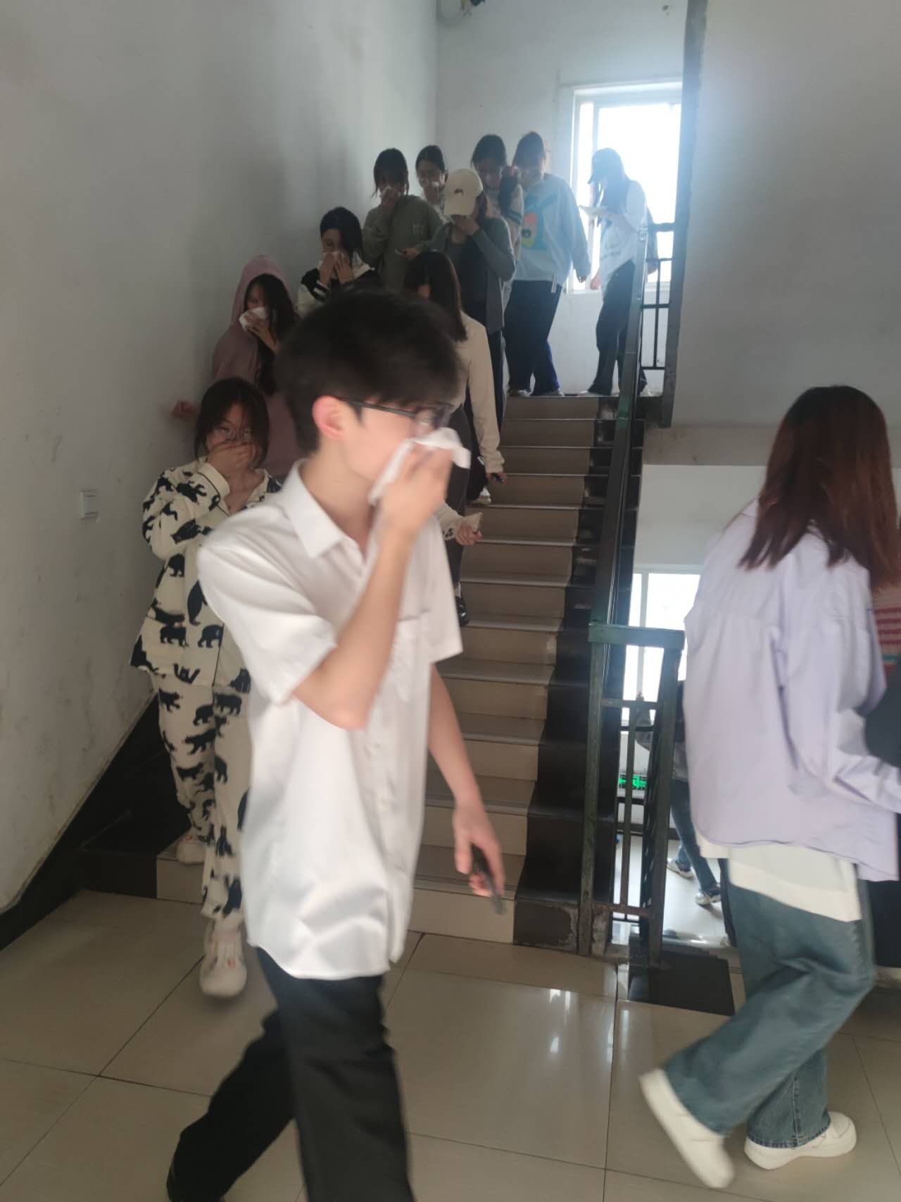 随着警报声响起,演练正式开始。宿舍楼内烟雾弥漫,消防控制中心人员接收到火警报警信息后,立即启动应急预案,各楼层的疏导员迅速到位,指挥师生用湿毛巾捂住口鼻,弯腰低姿,按照预定的疏散路线迅速有序撤离。由传媒学院“戎光”志愿服务队扮演的消防员和应急救援队伍逆行而上,协助检查楼栋、救护伤员。整个过程紧张有序,用时约2分钟,全体学生无一遗漏地完成了疏散。