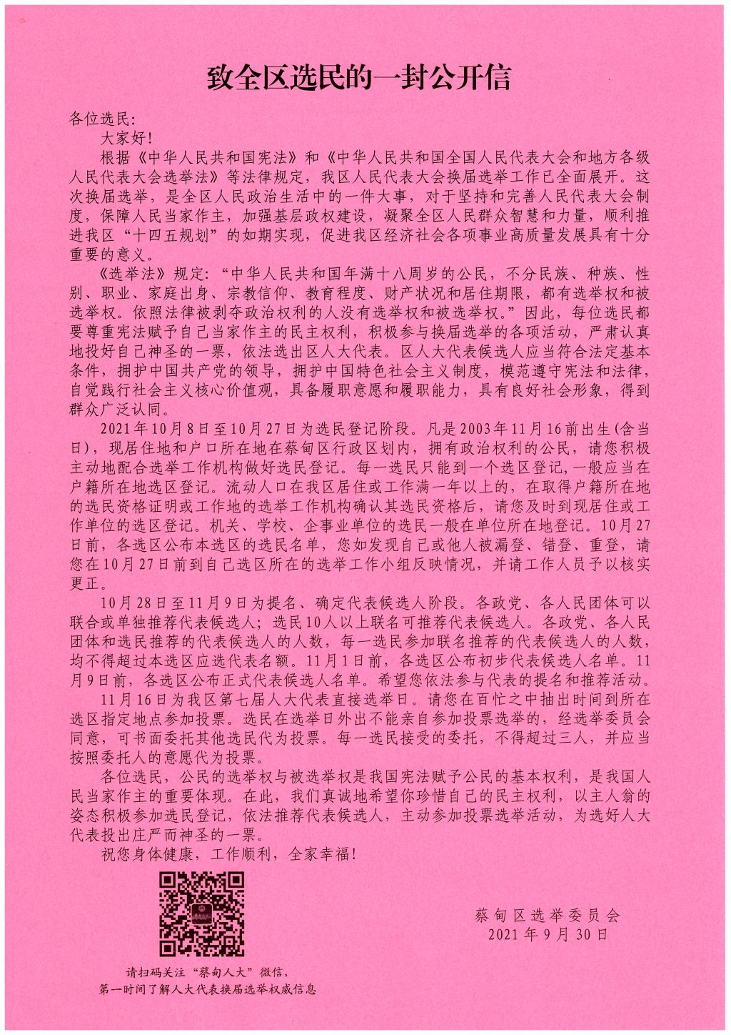 蔡甸区选举委员会致全区选民的一封公开信