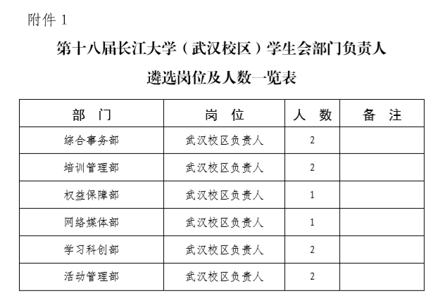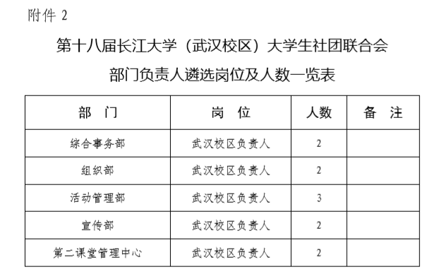 2.第十八届大学生社团联合会(武汉校区)部门负责人遴选岗位及人数见附件2;