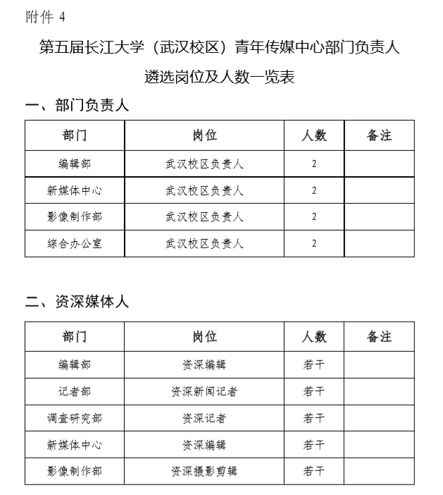 4.第五届青年传媒中心(武汉校区)部门负责人遴选岗位及人数见附件4;