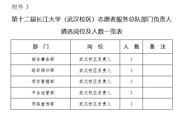 3.第十二届志愿者服务总队(武汉校区)部门负责人遴选岗位及人数见附件3;