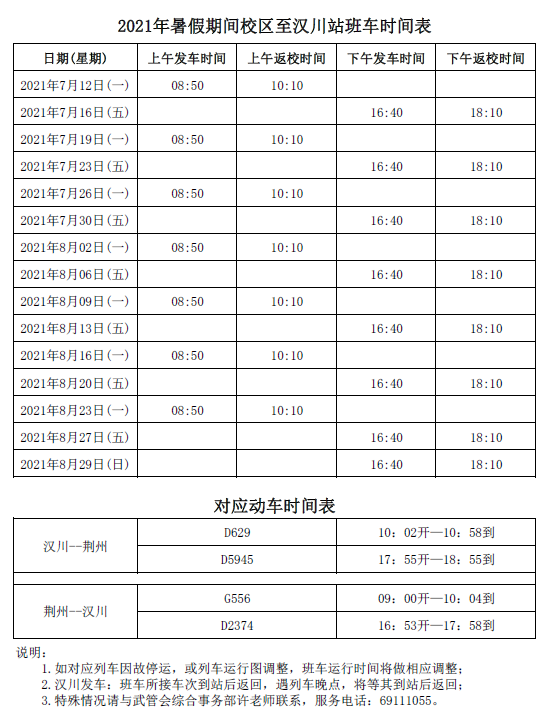 2021年暑假期间校区至汉川站班车时间表