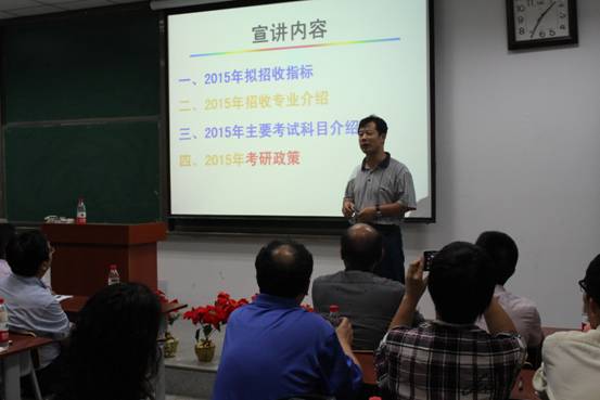 会议伊始,龚文平副院长首先向大家解读了2015年考研政策。他从招收人数、招生专业、主要考试课程、奖助学政策,四个方面进行了详细解读。他着重介绍了学校、学院今年奖助学政策的变化,研究生补助增至每人每年6000元。在学校奖励的基础上,学院还将对优秀学子奖励现金和工作电脑。龚院长还介绍了专业课考试改革情况,为了更好的衔接本科与研究生教学,地质学综合考试范围缩小,减轻了大家复习的压力。龚院长最后说道:“地科学院作为平均科研经费最高、博士硕士点最多、在校研究生规模最大的学院,欢迎大家踊跃报考,实现自己的学术梦想。”