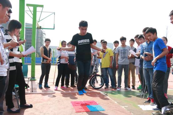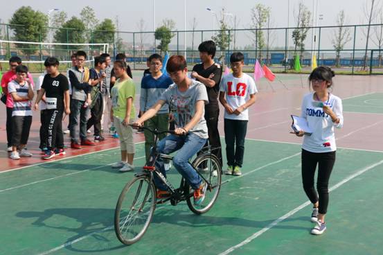 一段精彩的健美操表演“小苹果”开场之后,各班队员按照所抽顺序赶达相应的游戏位置开始游戏。露天小剧场处上演了一段别样的“中国跑男赛”,各班队伍每六人为一集体,“你追我赶”,提着纸带赶超前方队伍,撕下前方队伍的最后一名队员背后的班级牌来淘汰对手。与此同时,在排球场处,一场“不比谁快比谁慢”的自行车竞技正在进行,队员们骑着自行车,摇摇摆摆,努力让13×4米的骑行路程接力变得更为漫长。该过程中,运动员双脚或单脚任意部位不得接触地面,在四名同学全部完成骑行后,用时最多小组获得比赛胜利。
