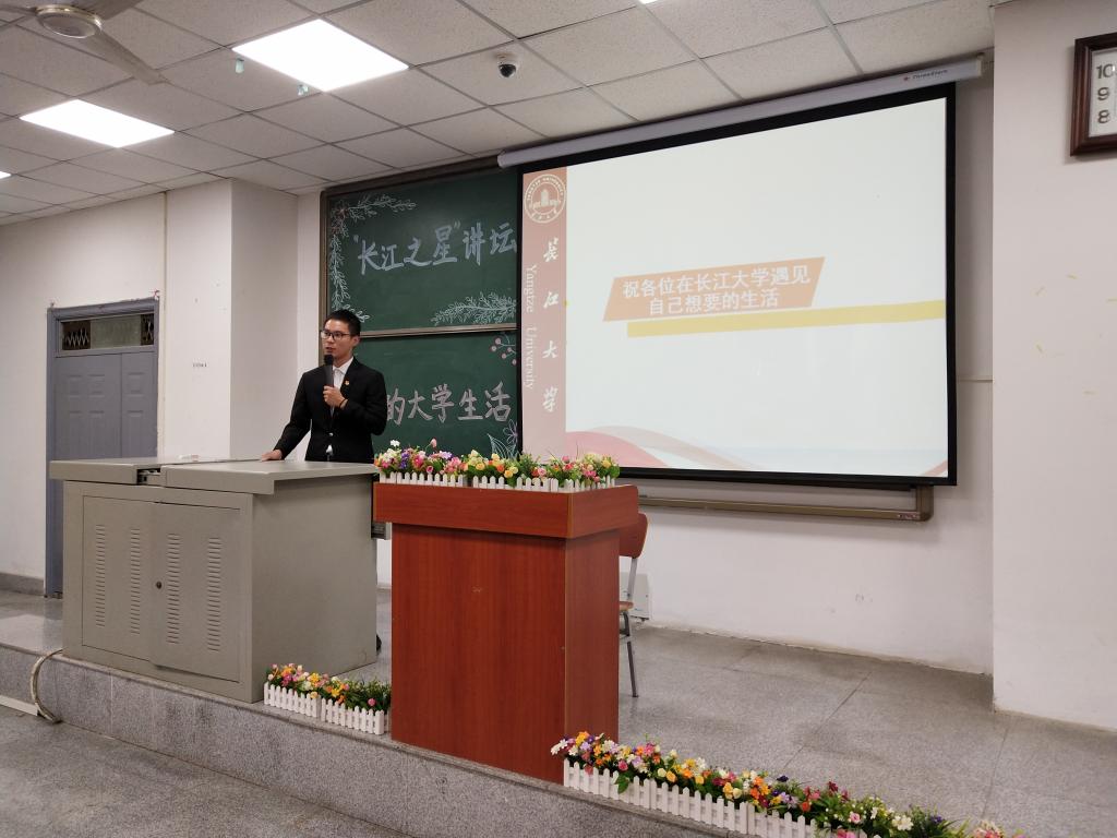 (见习记者 刘婉怡 孙家惠/文 李非佩 戴玉 摄通讯员 胡惠凌/摄)10月19日晚,本学期第一期“长江之星”讲坛在B教105举行。主讲人勘工(卓越)21601班的熊博同学围绕着“我的大学生活”向大家分享了他的大学经历。