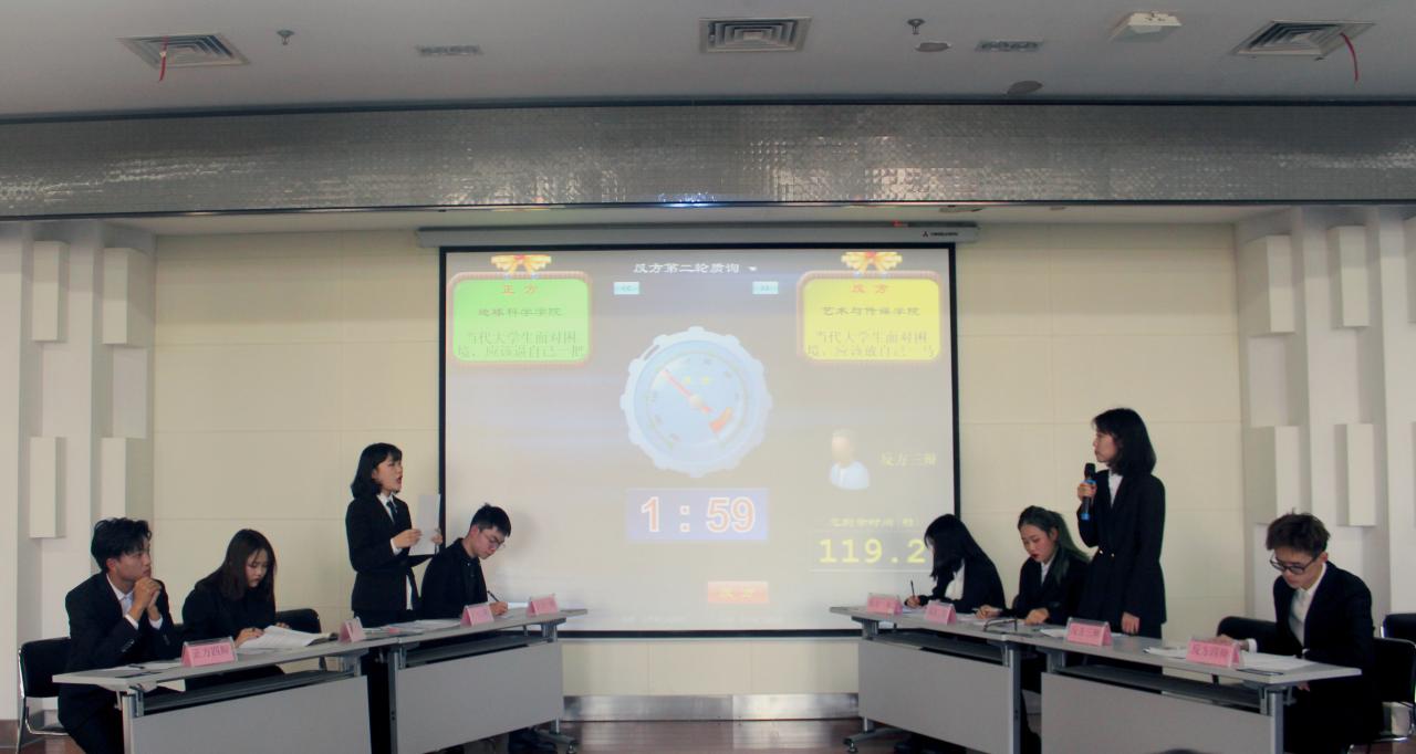 经过初赛、复赛、半决赛的层层比拼,最终地科学院代表队和艺传学院代表队脱颖而出,角逐最后的桂冠。辩论赛全程共分开篇立论、质辩环节、自由辩论、总结陈词四个环节。双方辩手就当代大学生面对困境,应该逼或是放自己一把展开激烈交锋。地科学院代表队所持为正方观点:当代大学生面对困境,应该逼自己一把;艺传学院为反方观点:当代大学生面对困境,应该放自己一马。