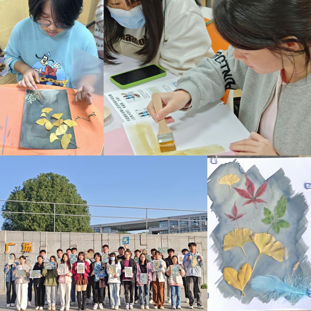 在室内,了解完活动意义和蓝晒制作工艺后,同学们便全身心投入到蓝晒作品的创作中。大家轻轻的刷出蓝晒底色,并将一片片落叶精心平铺在宣纸上,情绪也随着画面的丰满而流动起来。紧接着,同学们来到户外求实广场,一边晾晒画作,一边参与“逛三园”和“就不听指挥”游戏,让自己和画作共同沐浴在冬日暖阳中。欢声笑语久久萦绕,阳光温暖洋溢幸福。