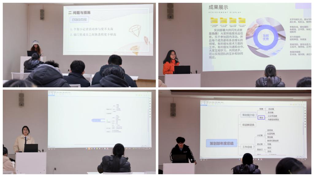 会议第二阶段,记者团4个部门代表分别总结汇报后,指导老师李莹肯定了各个部门的主要成绩,并结合近期具体的大型会议和活动的宣传任务,详细讲解了相关突发情况处理、现场师生采访流程、各个部门新的一年工作重点等。