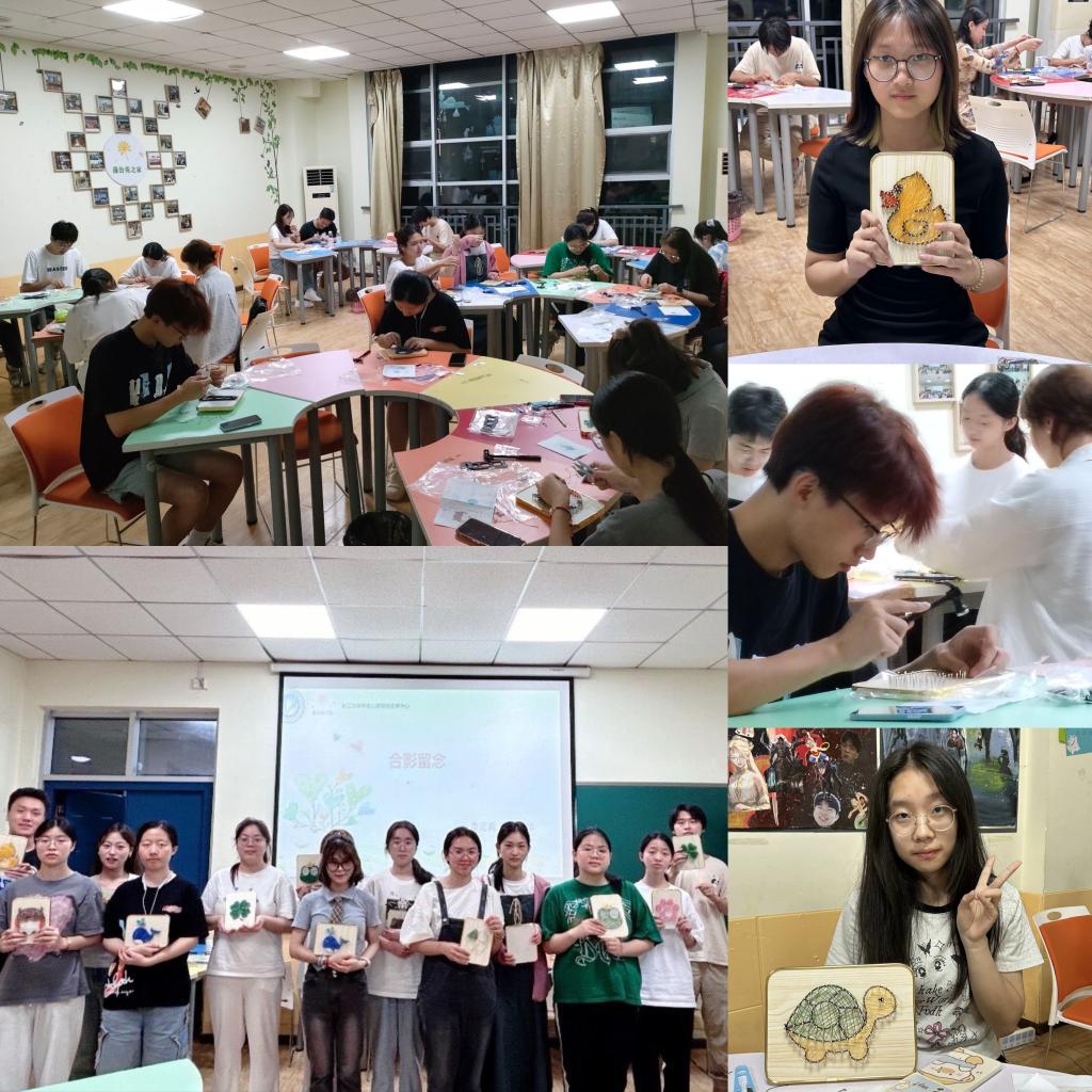 本场活动是制作钉子绕线画。活动中,主持人介绍了活动内容,同学们逐个进行了自我介绍,大家在轻松活泼的氛围中相互认识,随后便投入到作品制作中。创作中,同学们小心翼翼的敲敲打打,全神贯注的缠绕丝线。随着时间的流逝,小黄鸭、小乌龟、小鲸鱼、小青蛙……各式各样的可爱形象逐渐出现。看着自己亲手完成的作品,同学们脸上都不禁洋溢起快乐的笑容。
