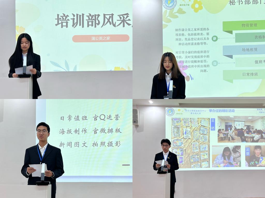 在部门风采展环节,培训部、秘书部、宣传部、活动部部长依次登台,通过精美的PPT详细介绍了本部门的工作职能、人员构成以及工作规划。