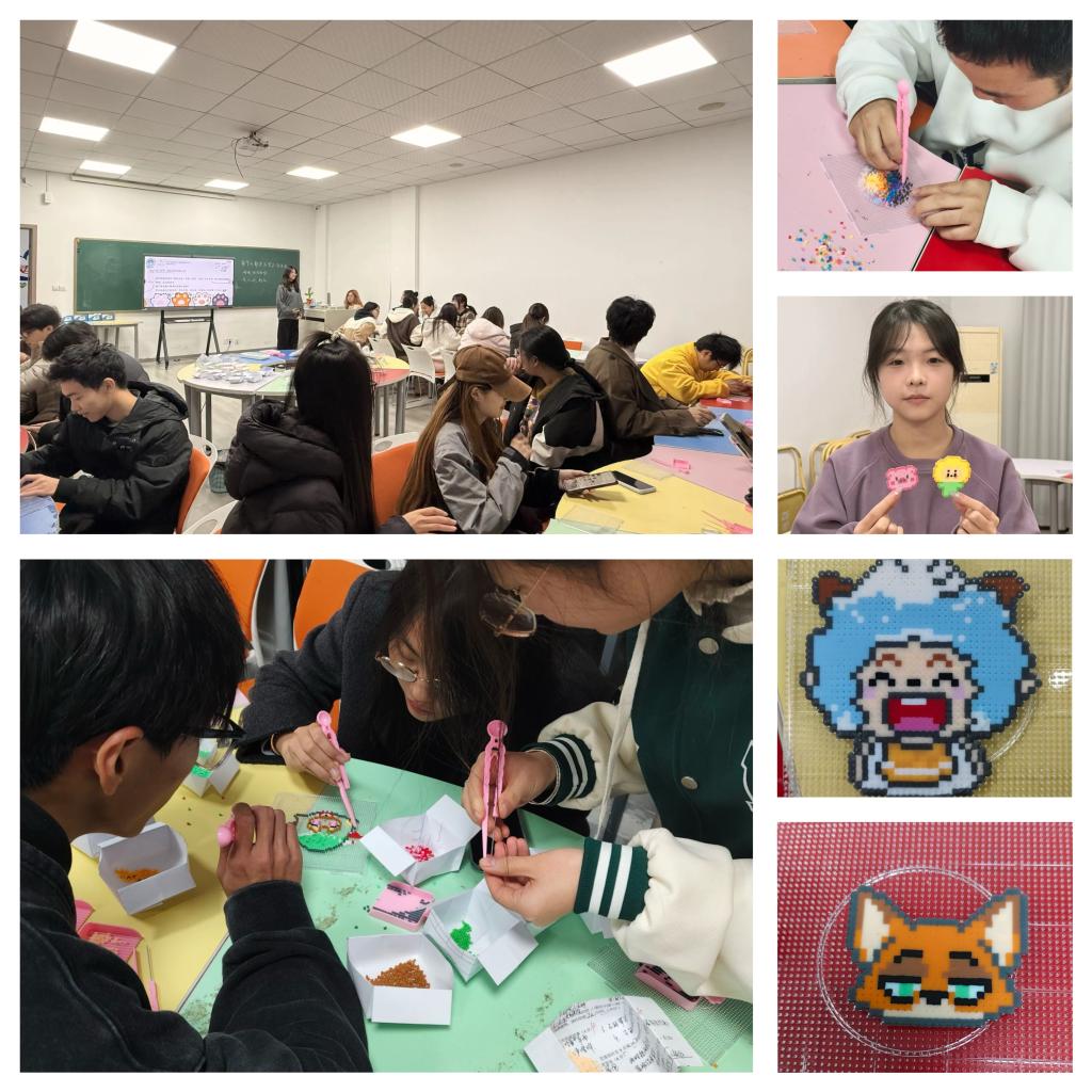 在确定好拼豆模板后,结合提前准备的镊子,拼盘和拼豆等工具,同学们或参照模板或自由发挥,将一颗颗色彩各异的拼豆拼接成生动的图案。现场氛围温馨而专注,同学们的艺术细胞在此刻大放异彩,大家互帮互助,共同创作出一个个精美的拼豆作品。