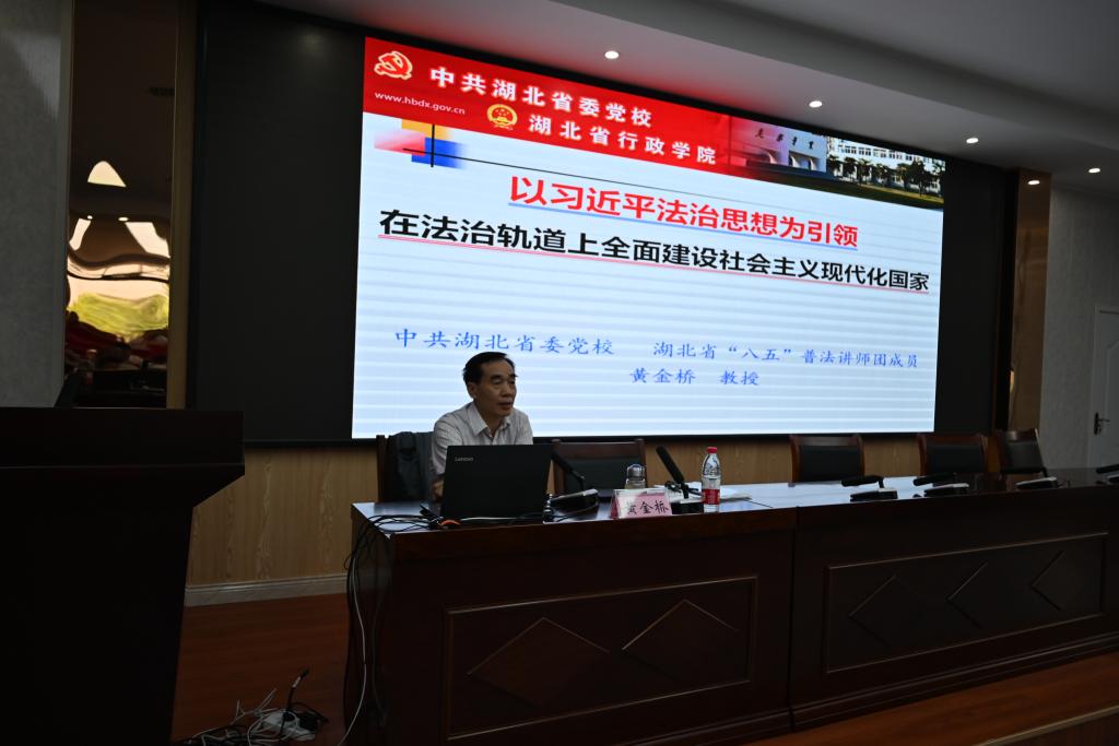 (通讯员 李莹)为巩固学习贯彻习近平新时代中国特色社会主义思想主题教育的学习效果,增强对习近平法治思想的认识,5月25日下午,武管会全体党员在校区B110会议室聆听了题为“以习近平法治思想为引领,在法治轨道上全面建设社会主义现代化国家”的专题讲座,主讲人为中共湖北省委党校、湖北省“八五”普法讲师团成员黄金桥教授。